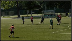 Mecz od początku nie powalał na kolana swoim tempem. W piekącym słońcu zawodnicy leniwie rozgrywali piłkę i nie palili się zbytnio do dynamicznych rajdów. Te piłkarskie szachy wychodziły na początku nieco lepiej czerwonym, którzy jako pierwsi objęli prowadzenie i dwukrotnie odzyskiwali je, gdy rywale zdołali wyrównać stan meczu. Wyrównana walka trwała jednak tylko do 30 minuty. Po pierwszych dwóch kwadransach w grze czerwonych coś się zacięło, tymczasem zieloni coraz lepiej rozumieli się na boisku i coraz śmielej poczynali sobie w polu karnym rywali. Jeszcze przed przerwą zadali cztery ciosy, które pozwoliły im po raz pierwszy prowadzić w tym spotkaniu. Po przerwie dołożyli kolejne trzy trafienia, w tym kuriozalne gole Kołodzieja, który w odstępie kilkudziesięciu sekund dwukrotnie w identyczny sposób pokonał Piętasa - po strzale napastnika zielonych bramkarz czerwonych interweniował tak pechowo, że nabijał piłką rywala i futbolówka trafiała do bramki. Takich goli było zresztą w tym meczu więcej - trafieniem w podobnym stylu popisał się w pierwszej połowie Walter.